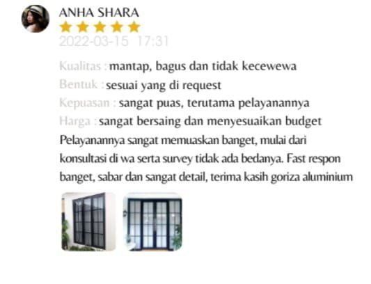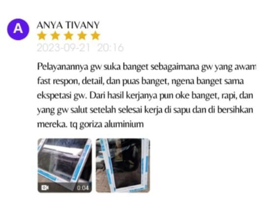 Goriza Aluminium menjadi salah satu perusahaan jasa pemasangan bahan kontruksi terpercaya di Jabodetabek yang berfokus pada spesialis besi, aluminium dan kaca. Legalitas lengkap, akad jelas, lokasi kantor maupun workshop yang tersedia menjadi faktor terbesar klien memutuskan untuk menggunakan jasa kami, agar tercipta kenyamanan, ketenangan, dan keamanan dalam bertransaksi bagi pelanggan. Berdiri sejak tahun 2020.